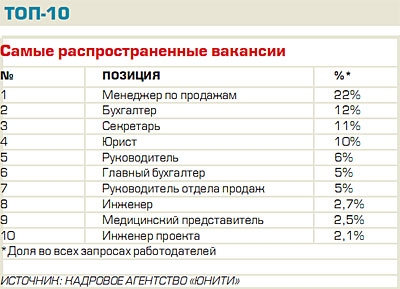 На второй позиции расположился бухгалтер, а тремя позициями ниже - главный бухгалтер. Как и раньше, доля этих позиций среди остальных заказов от работодателей - 12% и 5% соответственно. Такая стабильность объясняется просто. "Без бухгалтера ни одна даже самая маленькая фирма не справится", - рассказывает Анна Михайлова, руководитель группы подбора персонала кадрового центра "Юнити".