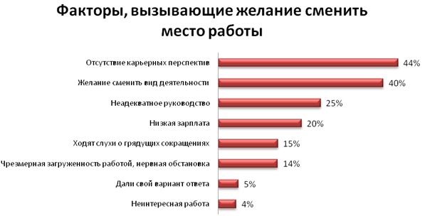 Наиболее популярными причинами, вызывающими желание сменить работу, являются такие факторы как «отсутствие карьерных перспектив», о котором упомянули 44% участников опроса, и «желание сменить вид деятельности» (40% соответственно). «Неадекватным руководством» оказались недовольны 25% респондентов. Интересно, что всего 20% опрошенных связали свои мысли об уходе с низкой заработной платой. 15% сотрудников, принявших участие в опросе, заявили, что планируют искать другого работодателя в связи со слухами о грядущих сокращениях. И, наконец, недовольными чрезмерной загруженностью работой и нервной обстановкой в офисе оказались 14% респондентов. (При ответе на данный вопрос респонденты могли указать несколько вариантов ответа).
